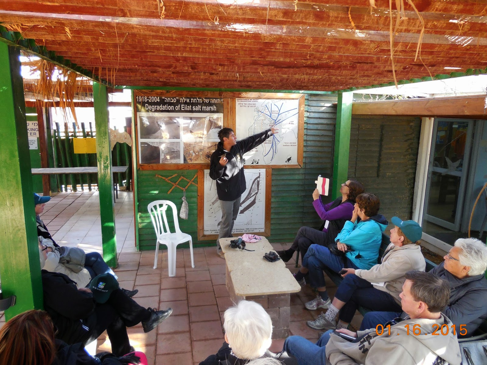 This was the fifth day of the CAARI Program and the third touring day in Eilat. The CAARI program stays at the Prima Music Hotel on the South Beach of Eilat and today we left at 8:30 an headed towards the Jordanian border for the IBRC, The Israel Bird Watching and Research Center in Eilat .There we met up with Noam the managing director. Our faithful 12 toured the ponds and man made salt marshes north of the hotels on North Beach Eilat. Noam explains the route of bird migrations and the importance of the land bridge that Israel serves for hundeds of migrating birds twice a year. This center located close to the Jordanian border is sustained by 5 bodies: JNF-KKL, The Ministry of Tourism, The Society for Preservation of Nature in Israel, The Municipality of Eilat and The National Parks and Nature Reserve Authority. Shown below is Noam expalining to CAARI seasona bird behaviour.