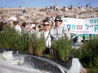 The next morning, energized by a good night’s sleep and delicious Israel breakfast, we left at 7:45 a.m. for another celebration of Tu B’Shevat, this one in the forest near Modiin, part way between Tel Aviv and Jerusalem where JNF, Jewish National Fund organized a day of tree planting, and supplied some 15,000 seedlings. Here all over rocky hillsides, little white flags decorated the area. Each one marked a pre-dug hole, the right size for a tree seedling. First, members of our group each took a seedling, found a suitable place with a flag, and planted a tree, pressing the moist earth around it, and reciting a blessing over the tree. Then we took the flag as a reminder of our special commemoration of the holiday. After that, we went to work! On this holiday, Israelis come from far and near to plant trees. Our job was to actually give out the seedlings, mainly pine and cedar, to the people as they came by, and to direct them to the location for planting.