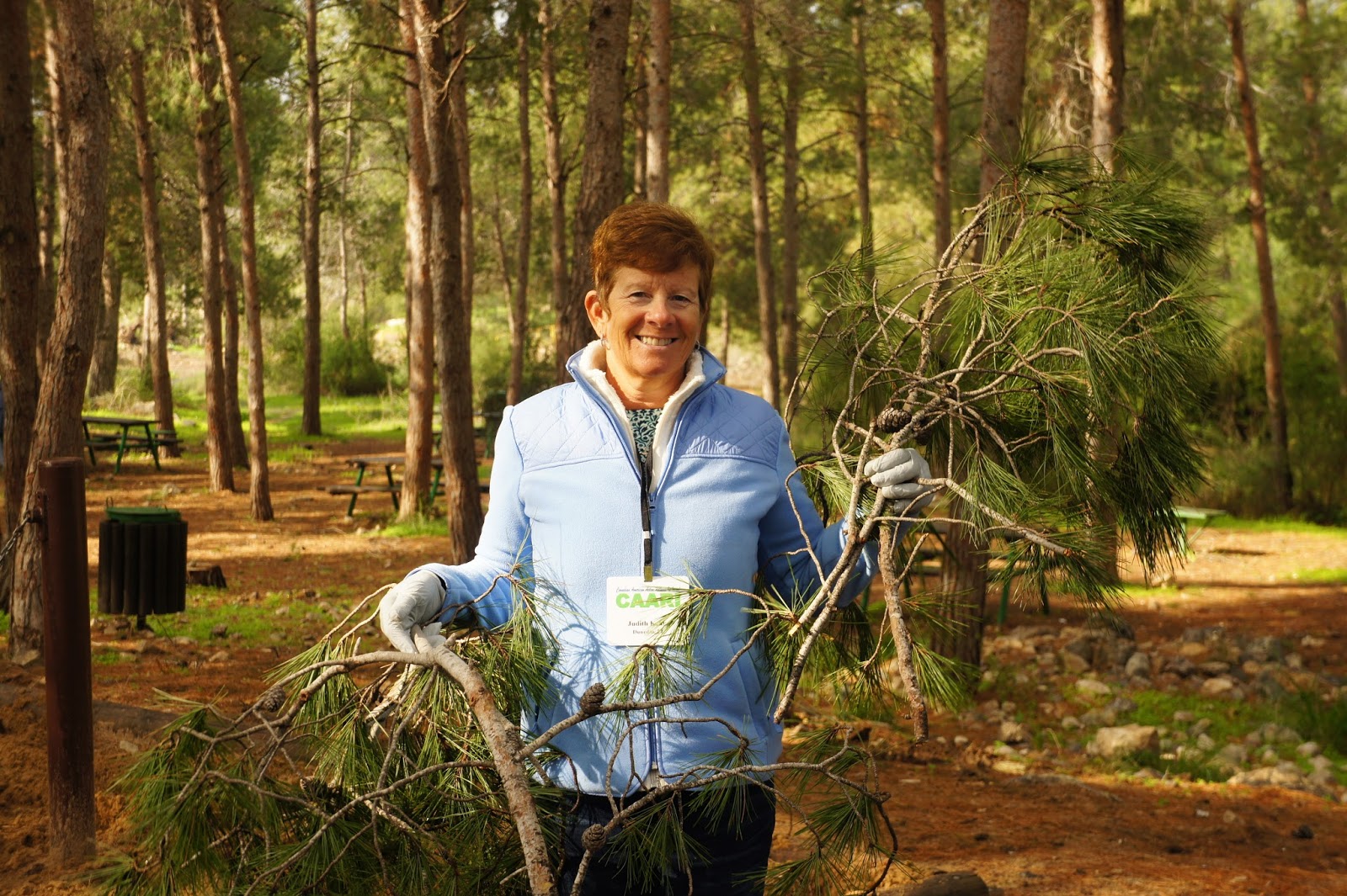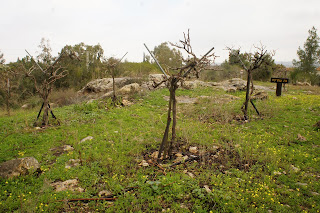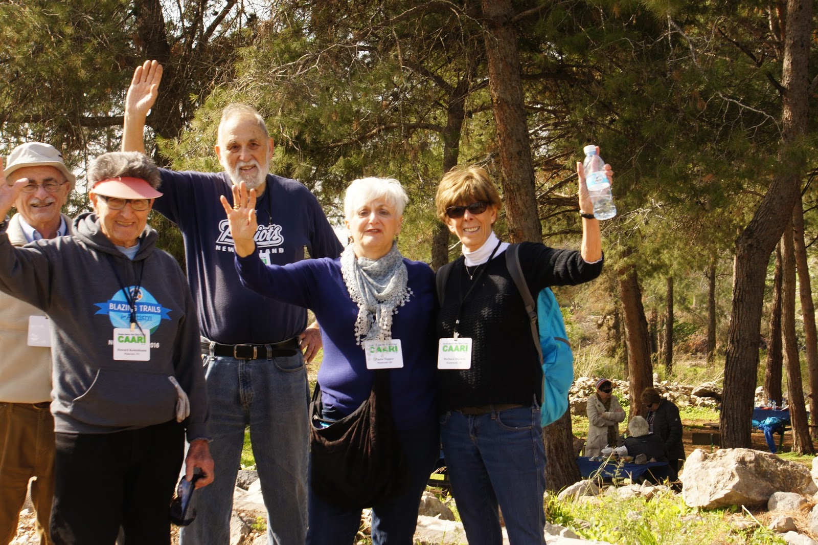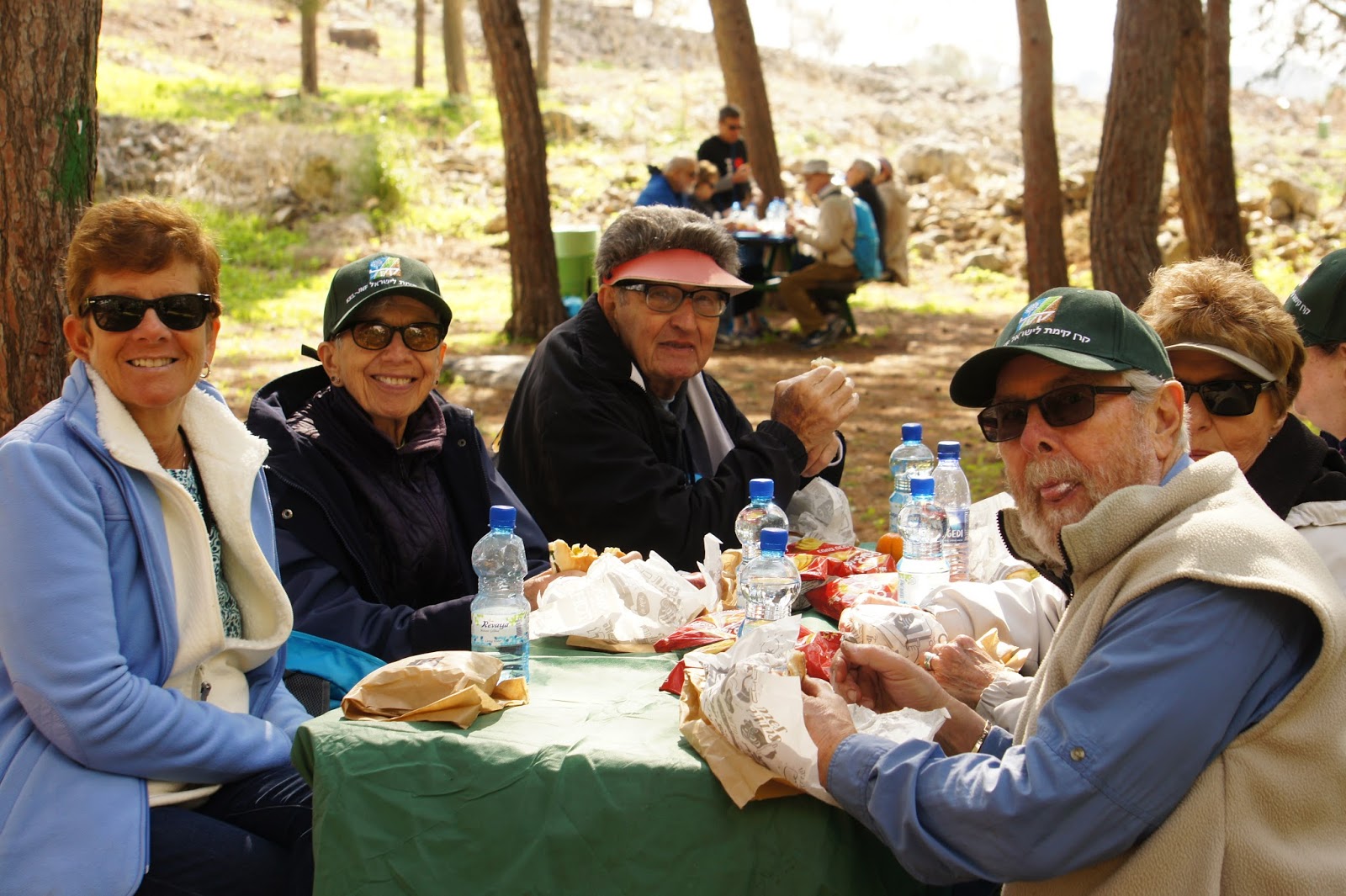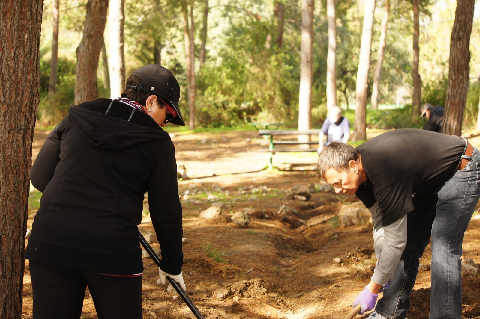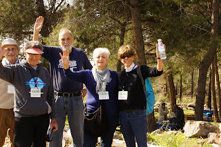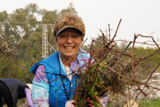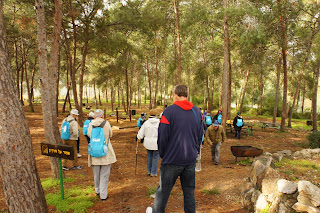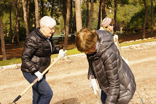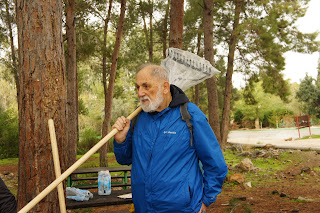 We were greeted by Miri and Yashkeeh, Hezi’s sister and Father. Yashkeh is a survivor from the Lutzk Ghetto in the Ukraine and was a platoon commander in the Palmach. With Yashkeeh’s marching orders, we were divided into three groups. With pick axes, rakes, hoes, paintbrushes, we began our assignments as instructed, to restore the vineyard and antiquities that were damaged by the fire. CAARI cleaned some of the marked trails and stone paths, dug drainage ditches, painted signs and picnic tables and by noon CAARI was ready for lunch. Yashkeh took us to the overlook named for his son and Nahum our guide explained the defensive barrier built in response to the Al Aksa uprising in 2000, the green line and the Palestinian City of Kalkilyia and the Community of Alfei Menashe.