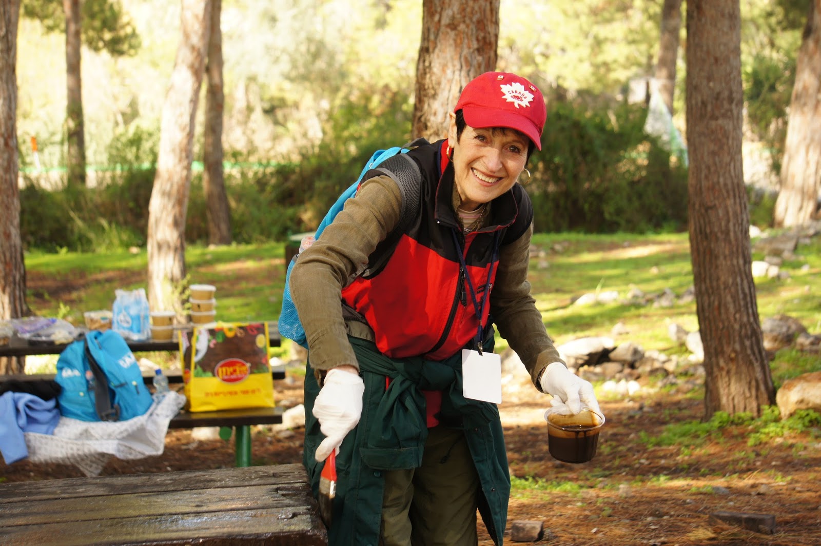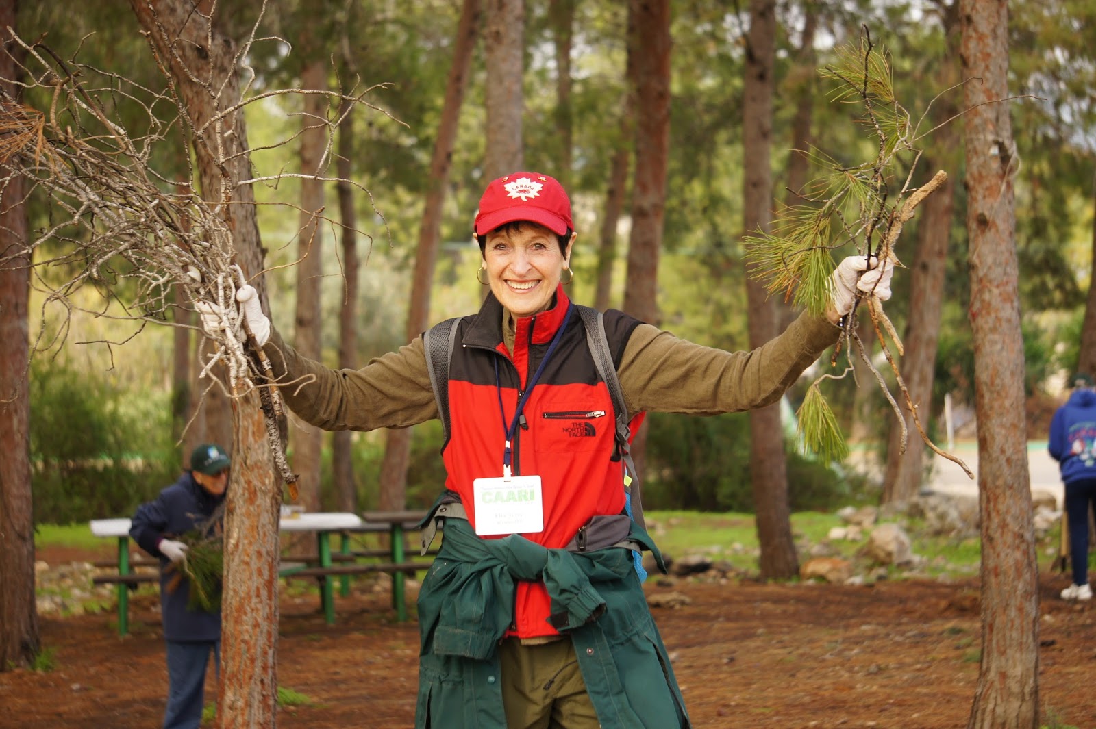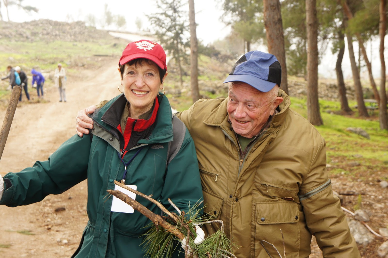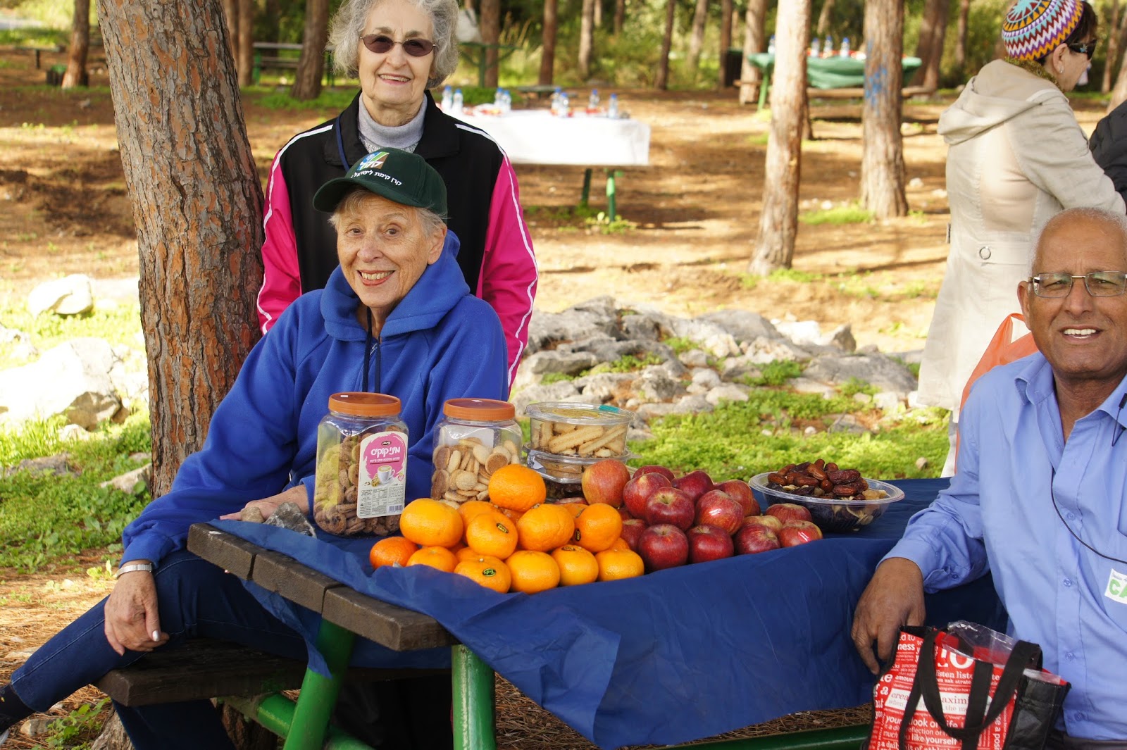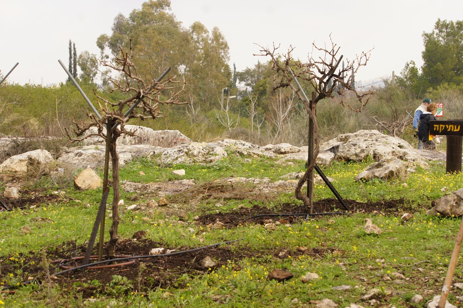 We were greeted by Miri and Yashkeeh, Hezi’s sister and Father. Yashkeh is a survivor from the Lutzk Ghetto in the Ukraine and was a platoon commander in the Palmach. With Yashkeeh’s marching orders, we were divided into three groups. With pick axes, rakes, hoes, paintbrushes, we began our assignments as instructed, to restore the vineyard and antiquities that were damaged by the fire. CAARI cleaned some of the marked trails and stone paths, dug drainage ditches, painted signs and picnic tables and by noon CAARI was ready for lunch. Yashkeh took us to the overlook named for his son and Nahum our guide explained the defensive barrier built in response to the Al Aksa uprising in 2000, the green line and the Palestinian City of Kalkilyia and the Community of Alfei Menashe.