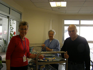 When we came in at 8 AM we set up the breakfast trays and handed them out to the patients as they came into the dining room. Usually about 35 came in between 8 and 9:30 AM. Following breakfast, I helped make beds, sometime refilled lotions and paper towels in the room or walked with patients that needed extra ambulation.