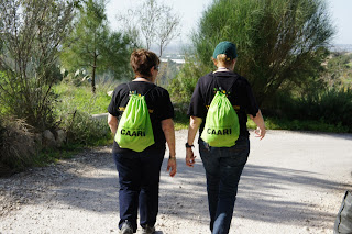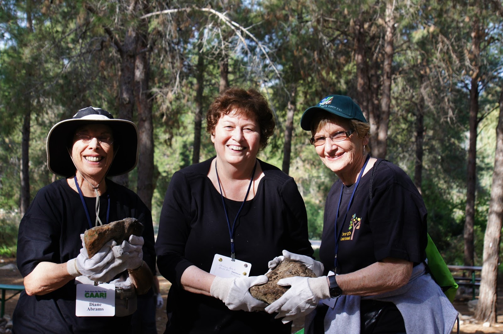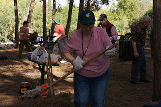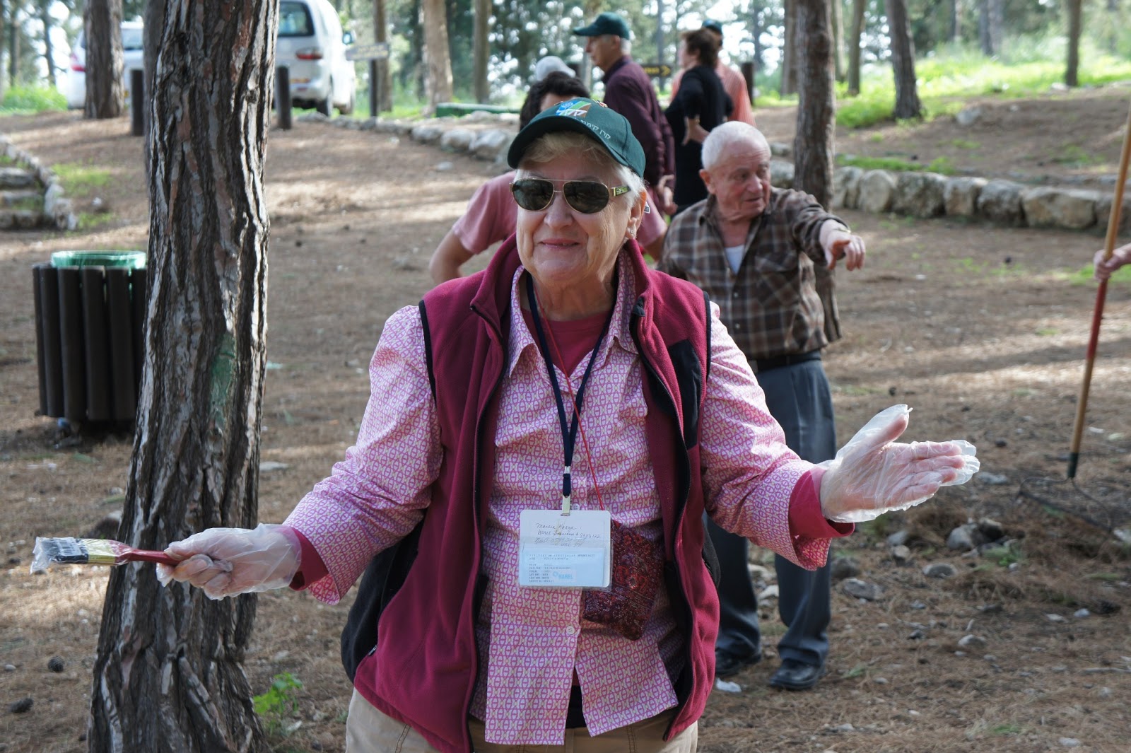 A wonderful day at Horashim Forest. Today was election day in Israel – most offices and schools were closed as it is a National Holiday. We were scheduled to do our ‘forest work’ in a special recreation area in the Horashim Forest. This recreation area was established by the family of a fallen soldier, who was the commanding officer of our guide, Neil Eisenstadt. The family wanted to do something to memorialize him So, with the help of KKL and JNF they set up this park area with swings, picnic tables, etc. We have visited this area and “spruced it up” before, but it has never been like it was today. What a difference a holiday makes! We arrived at the forest early at the request of the family as they knew that later in the morning it would be busy But, we didn’t realize that! They welcomed us with a drink and food – clementines, dried fruit, cold and hot drinks and cookies – all laid out on one of the picnic tables! After our ‘nosh’ we broke into groups, some of us raked, others painted picnic benches, signs and other wooden areas, other moved rocks from the main picnic area and other picked up ‘debris’! Even while we were working, people began to arrive with children, dogs and or course all the picnic supplies you could imagine! Did I mention that the weather was just perfect – sunny and in the high 70’s? It was wonderful to see everyone out for a picnic – barbecues were burning, children were on swings or the see-saw, dogs were running about – it was a quite a site! Some of our group spoke to the Israelis and told them who were – they thought it was wonderful of us to be here in Israel. After our work was completed we hiked through the forest, viewing the lovely springtime wild flowers as we made our way to the lookout over the area. Back to our picnic tables for our lunch. It was a perfect day!