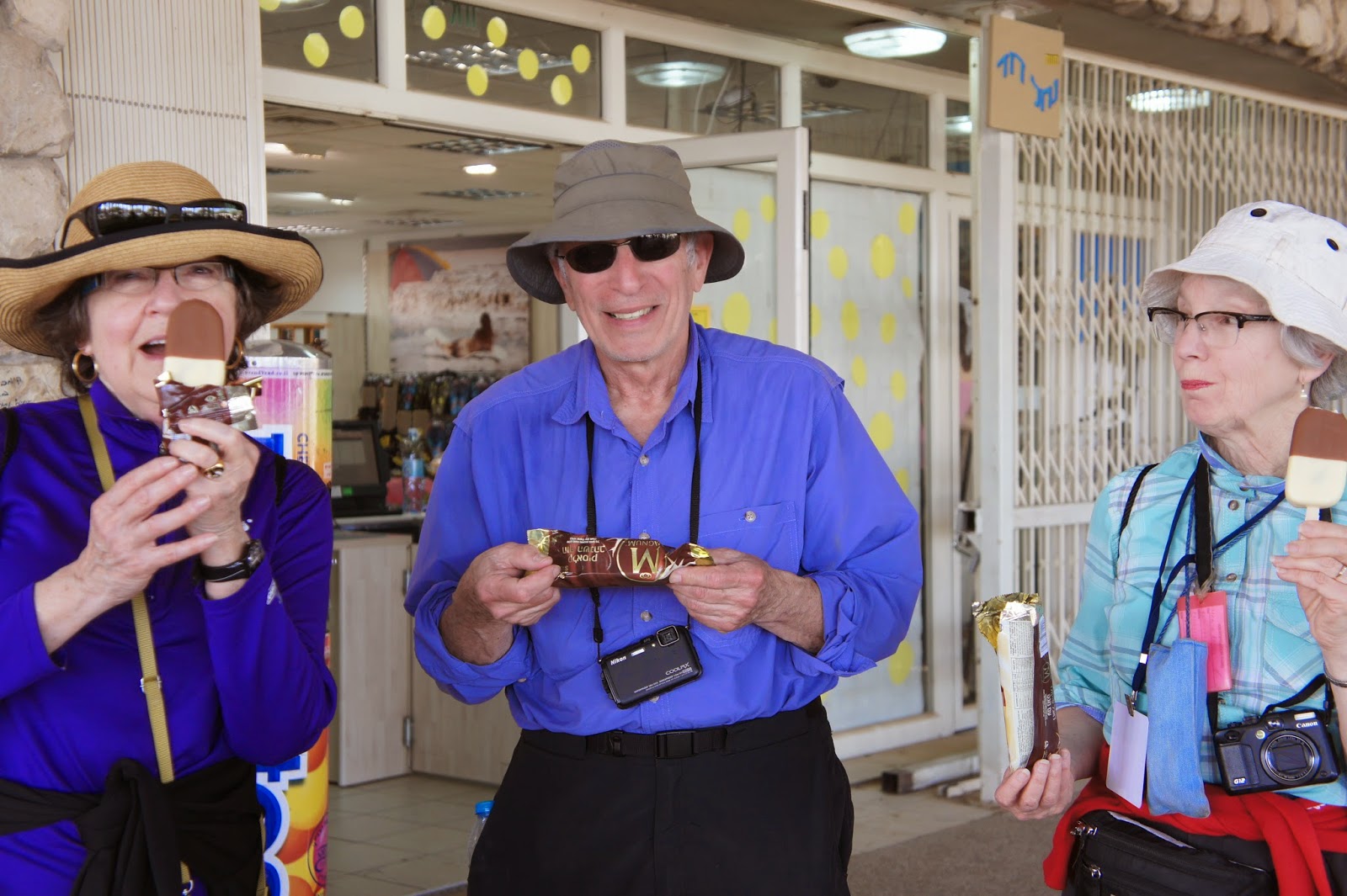Although the trail is described as easy – guess for the younger more experienced hiker- but never-the-less, it was still challange as we walked up and down many stone steps of uneven heights – some railings, crossed water area and climber up and down the hilly paths. The views were spectacular with the Dead Sea in view as you looked to the East and majestic mountains as you looked up to the West. Enjoy the many pictures of CAARI. It took us a little over an hour to do the hike. As you can see in the pictures – there is always time for ice cream!