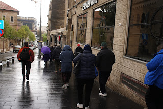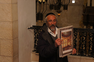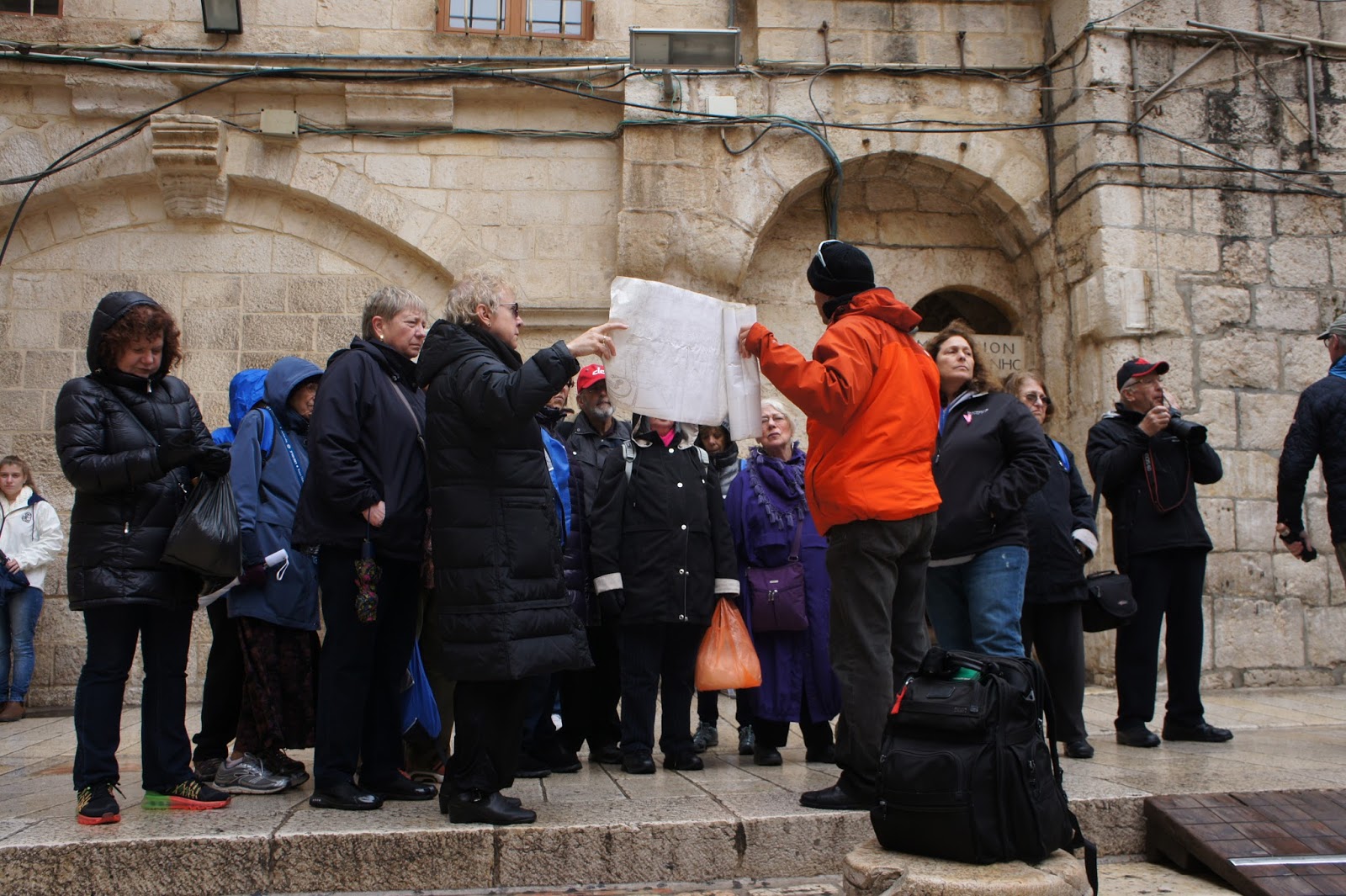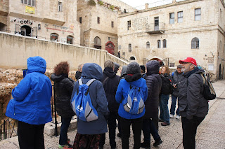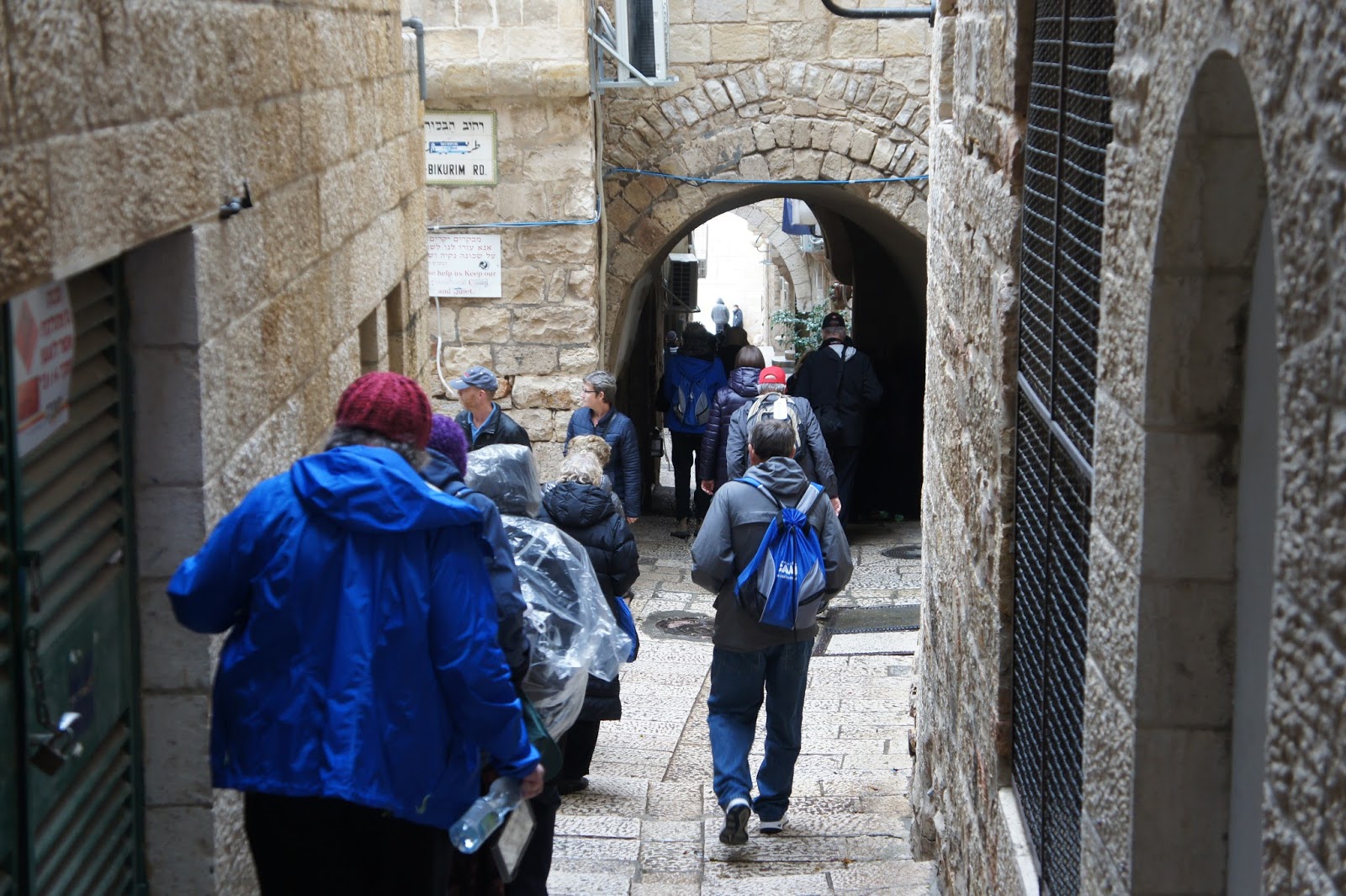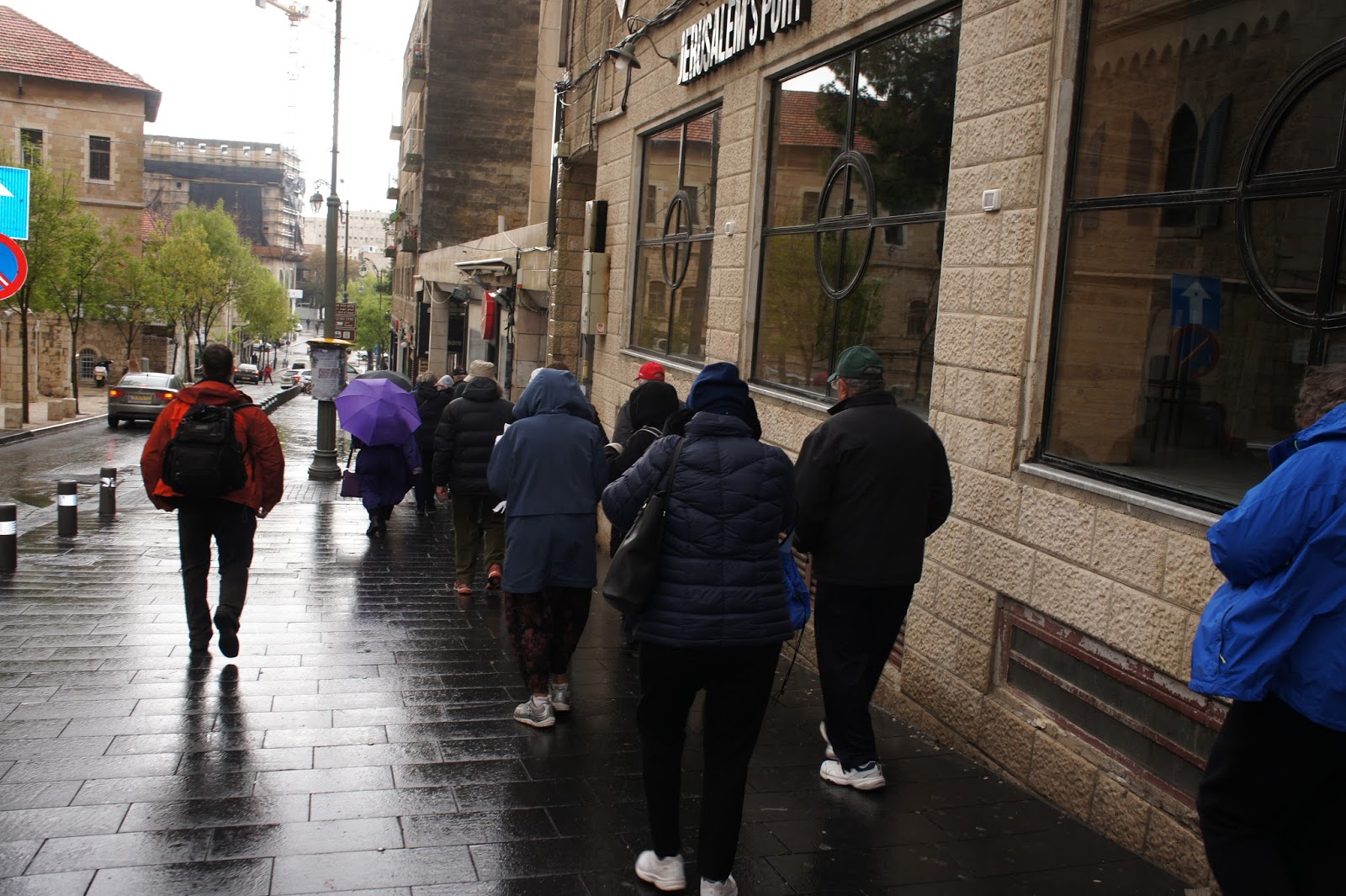 From there we drove to the  Zion Gate and walked in and out of rain showers, to the Jewish Quarter and another majestic synagogue, the Hurva.  Our local guide for this tour was Yoel and quite the guide who brought the history of the synagogue to life!  We first saw the main sanctuary filled with religious men studying the Torah.  From there Yoel took us to the basement of the building to see the ancient Roman Street.  The synagogue was founded in the early 18th century by followers of  Shabtei Zvi brought to Israel by Yehuda HaHasid in 1700 and  it was destroyed by the local Muslims in 1721 due to the fact that the Jewish population borrowed money and could not pay it back. Joel explained that the synagogue was rebuilt several times.  After the 6 Day War in 1967 one arch was rebuilt,and  after years of deliberation  the synagogue we rebuild and dedication in 2010.  The view from the roof, even in the pouring rain, was amazing.  Ask Gloria!