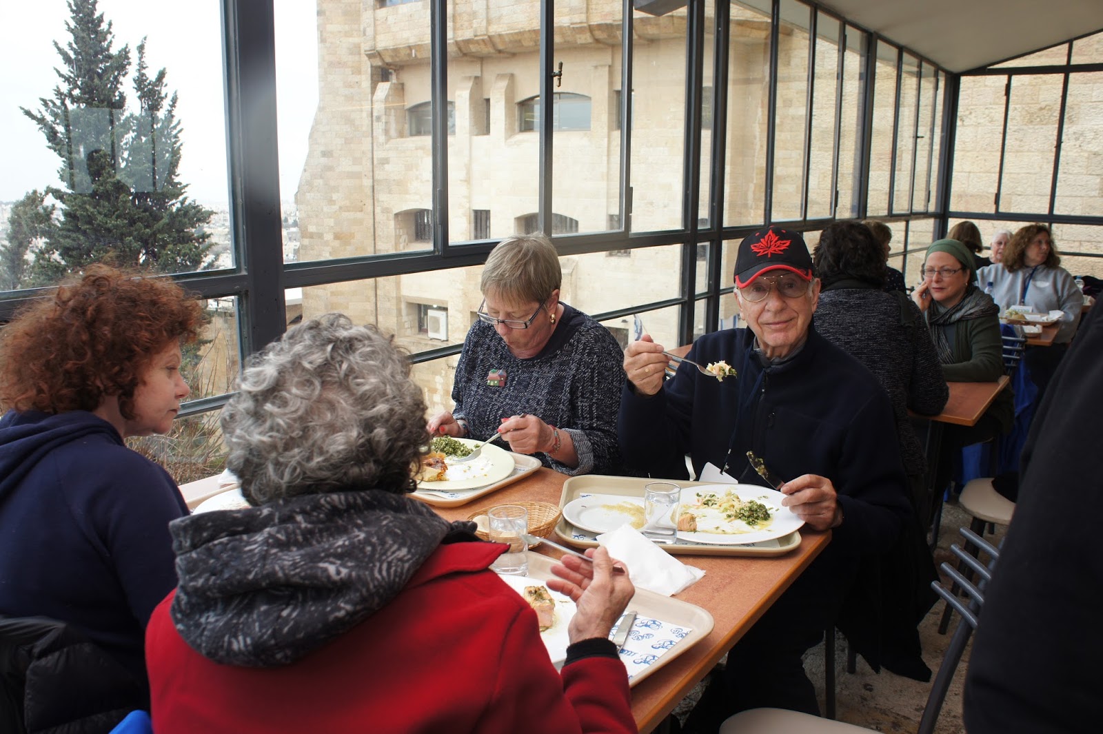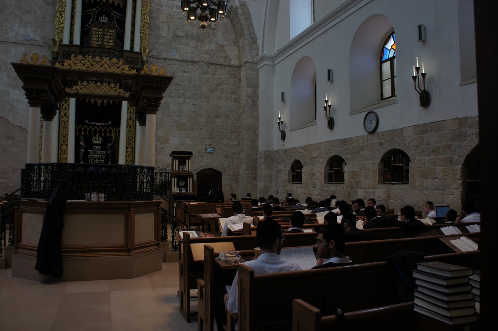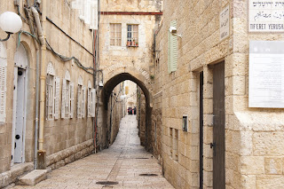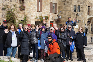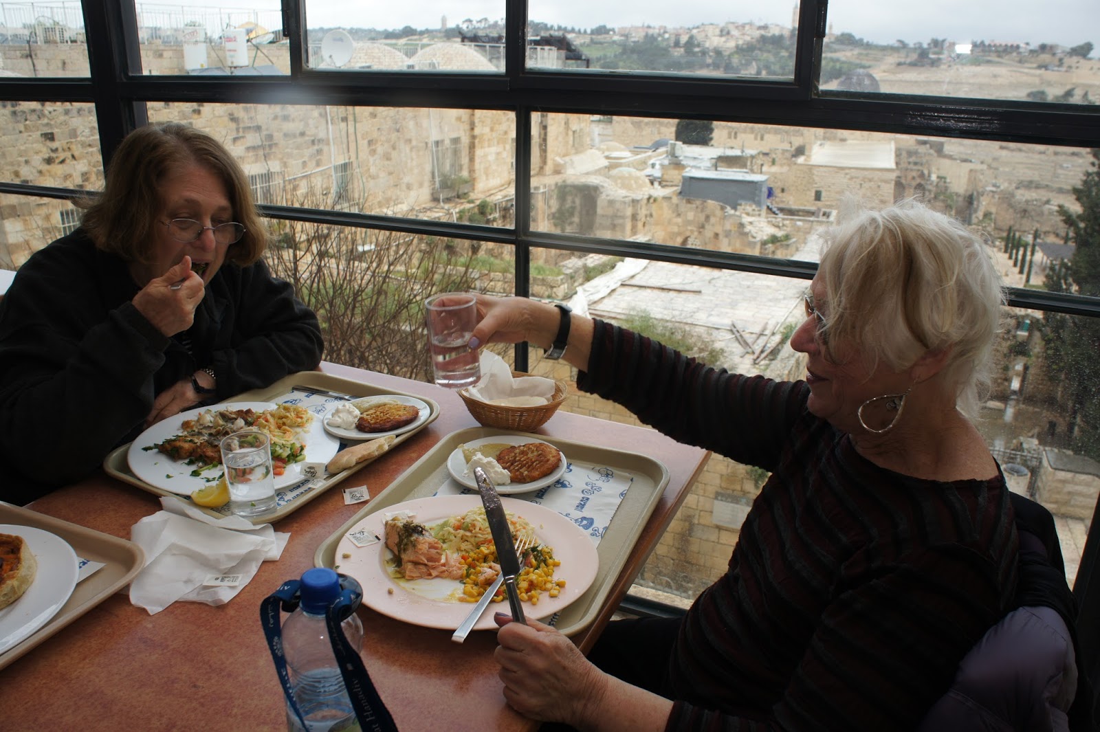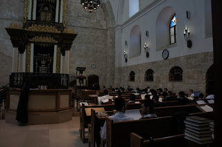 From there we drove to the  Zion Gate and walked in and out of rain showers, to the Jewish Quarter and another majestic synagogue, the Hurva.  Our local guide for this tour was Yoel and quite the guide who brought the history of the synagogue to life!  We first saw the main sanctuary filled with religious men studying the Torah.  From there Yoel took us to the basement of the building to see the ancient Roman Street.  The synagogue was founded in the early 18th century by followers of  Shabtei Zvi brought to Israel by Yehuda HaHasid in 1700 and  it was destroyed by the local Muslims in 1721 due to the fact that the Jewish population borrowed money and could not pay it back. Joel explained that the synagogue was rebuilt several times.  After the 6 Day War in 1967 one arch was rebuilt,and  after years of deliberation  the synagogue we rebuild and dedication in 2010.  The view from the roof, even in the pouring rain, was amazing.  Ask Gloria!