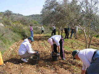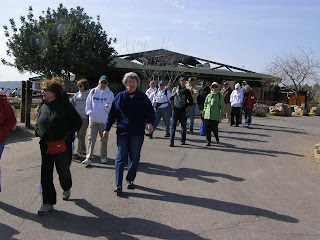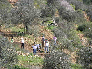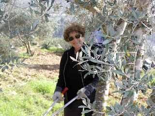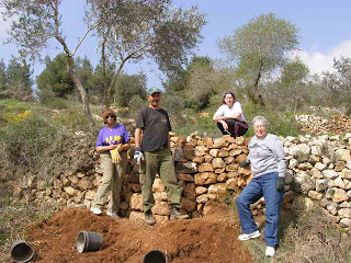 Back to the work clothes again. Yesterday we put on our grubbies and headed off to Sataf Forest to prune olive trees and rebuild part of a stone wall. Finding rocks all over the ground, we filled bucket after bucket of assorted sizes to use as “backfill” for the wall, while Jamil, experienced wall builder, put the large stones in place. Hard work, but very satisfying, especially after seeing the result. After a morning like that everyone felt very happy to leave for Kibbutz Tsorah for lunch and more. In addition to delicious quiches and salad, the lunch included cheeses and bread both made on the kibbutz. But, wait, there’s more. The Kibbutz also has a boutique winery, and lunch included wine tasting. The grapes come from three different nearby areas, and last year the winery produced ice wine! Yes, and without that inconvenient winter season. The grapes were picked and put into the freezer and the wine produced at a later time.
