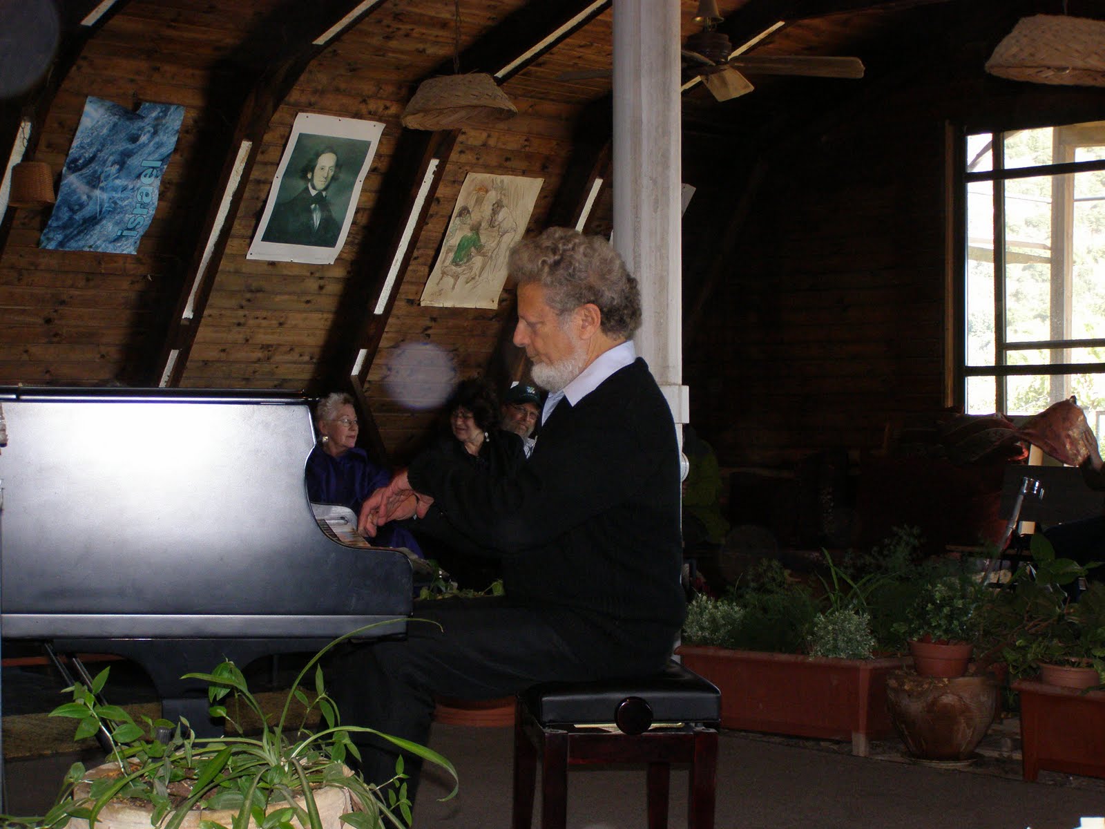 The next stop, a CAARI first, took us to the top of a mountain for a private piano recital. Yes, that is correct. Yitzak Tavior, virtuoso pianst, composer and conductor, lives with his family in the area of Mt. Meron in the Galilee where he present concerts on Saturday mornings, but gave a command performance to our group this morning. The concerts take place in his studio, a large room with seating around three sides and clusters of potted plants forming a border around one side of his grand piano. On the walls hang large portraits of composers. Maestro Tavior welcomed us and explained that he was probably the only pianist who would serve refreshments at the intermission. He sat down, began to play, and we were entranced. The first part of his program included movements from Mozart and Beethoven sonatas and a Chopin Scherzo, all played with energy and sensitivity and great feeling. Then true to his words, he stood up walked over to the far side of the room and offered coffed, herb tea and cakes which his wife Liora had brought earlier. After everyone finished, Maestro Tavior walked back to the piano, opened the lid and over the keyboard and continues with a Brahms Intermezzo and a final work by Debussy. Sheer joy…