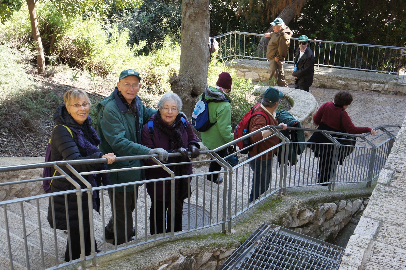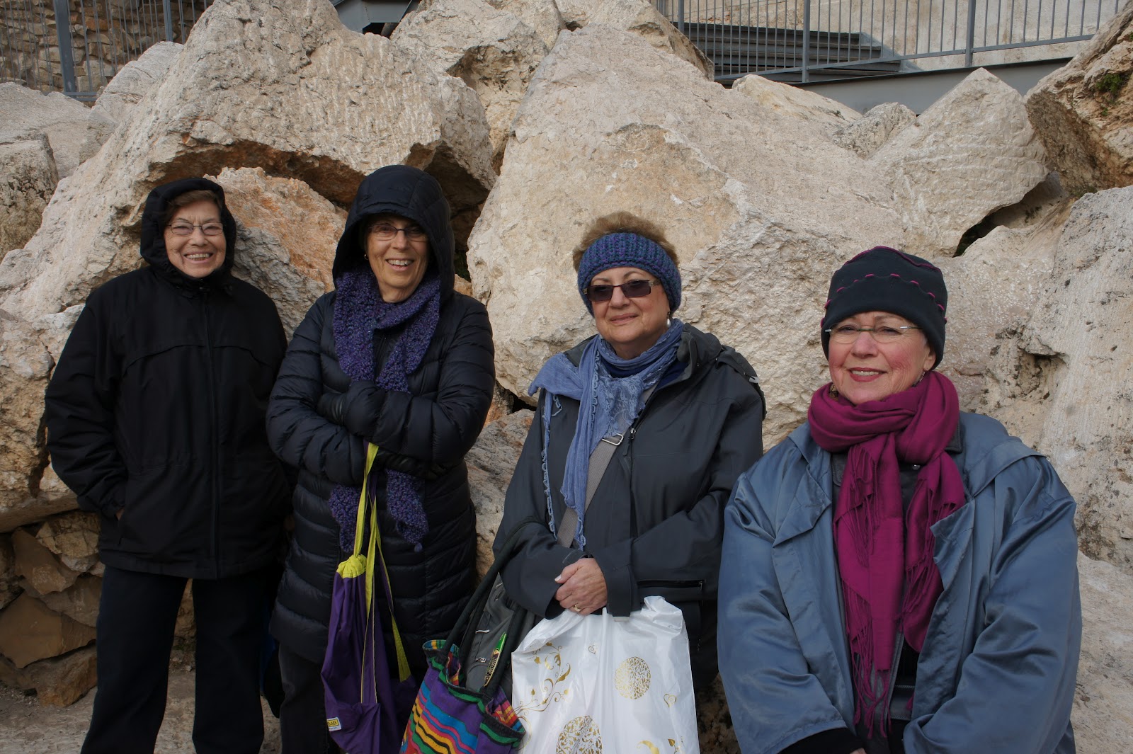 Our bus picks us up to take us to the Zion Gate to enter the Jewish Quarter – yes, time for lunch! Our meeting place after lunch is area in front of the Hurva Synagogue – Neil gives us a little history, as we will be touring the synagogue at the end of the week. We continued walking through the Jewish Quarter, down the many steps to the Kotel, the Davidson Center and the Southern Wall Excavations. As we get to the Women’s section of the Kotel we are told that we can’t enter. How can that be? A new rule? Where will the women pray? Oy, now what did they do? Finally, we find someone who explains that they are performing construction work in the area and they have divided the men’s section and women can pray in that area. For many of us, this is first time in the men’s section – imagine that? We reach the Davidson Center – very modern building built among the ancient rocks. The guide, who was terrific, takes us to a theater where he shows the virtual model of the area during the 2ndTemple Period. Then, Neil takes us around the Southern Wall excavations where we can see the destruction from the time of the Romans. Now, it is getting cold and we are bundled up – time to return to the hotel to reflect on our day. Ah…but we have a speaker tonight – Barbara Goldstein from Hadassah who talks about Hadassah’s work and the new hospital wing, and what we can do as Ambassadors when we return to the USA. That was our day!