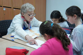 Gloria Kaufman, and myself to the audience and she, who is fairly good with Hebrew spoke to the kids, mostly in English and then we sang a bit of one of the songs that both of us are using with our groups. The smiles on my kids were as wide as they could have been…..they make me feel so appreciated….nothing better than that. After the assembly, I watched as the kids put the floor mats and chairs back in their place so that the auditorium became a gymnasium once again…..no custodian around here!! And the groups I worked with were so responsive and seemed to enjoy themselves so much……a teacher in the room during my session said she enjoyed the singing and would miss me and the good times we appeared to be having…..I will, too!!!