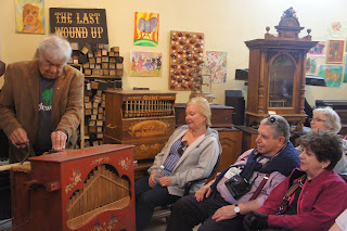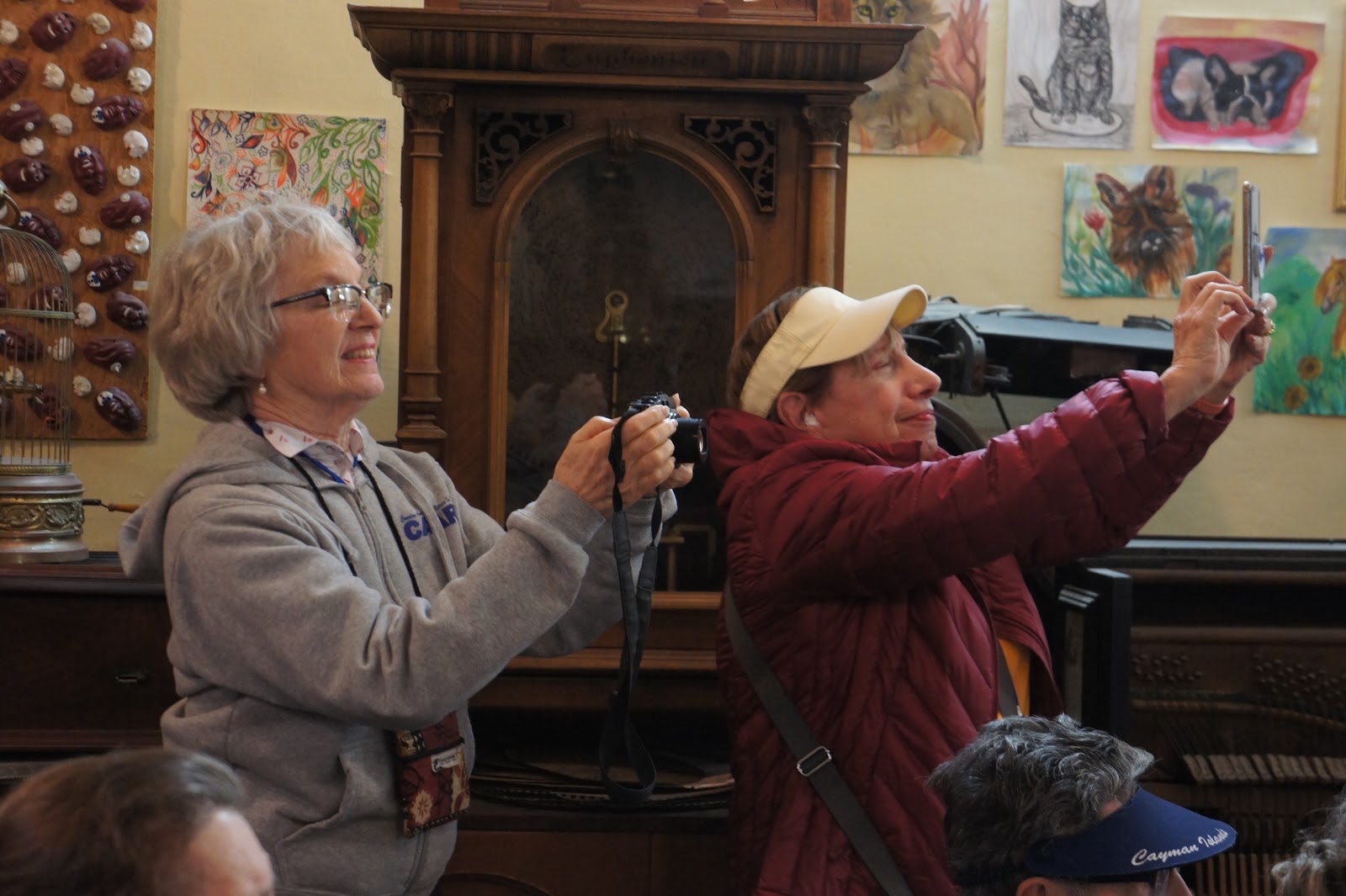 Nissan explained the original Edison phonograph and how the vibrations were etched onto a wax cylinder and reproduced to make sound. (May not be exactly accurate, but you get the picture!)Nissan traveled extensively and found some of the music machines in Europe and Africa. A family in Belgium needed to find a good home for the large and beautiful music machine. It was shipped in pieces and re-assembled in the Museum.When the music played, we saw the figures in action. The Conductor, centre, moved his baton up and down, while the two ladies at the side hit their bells in time to the music.