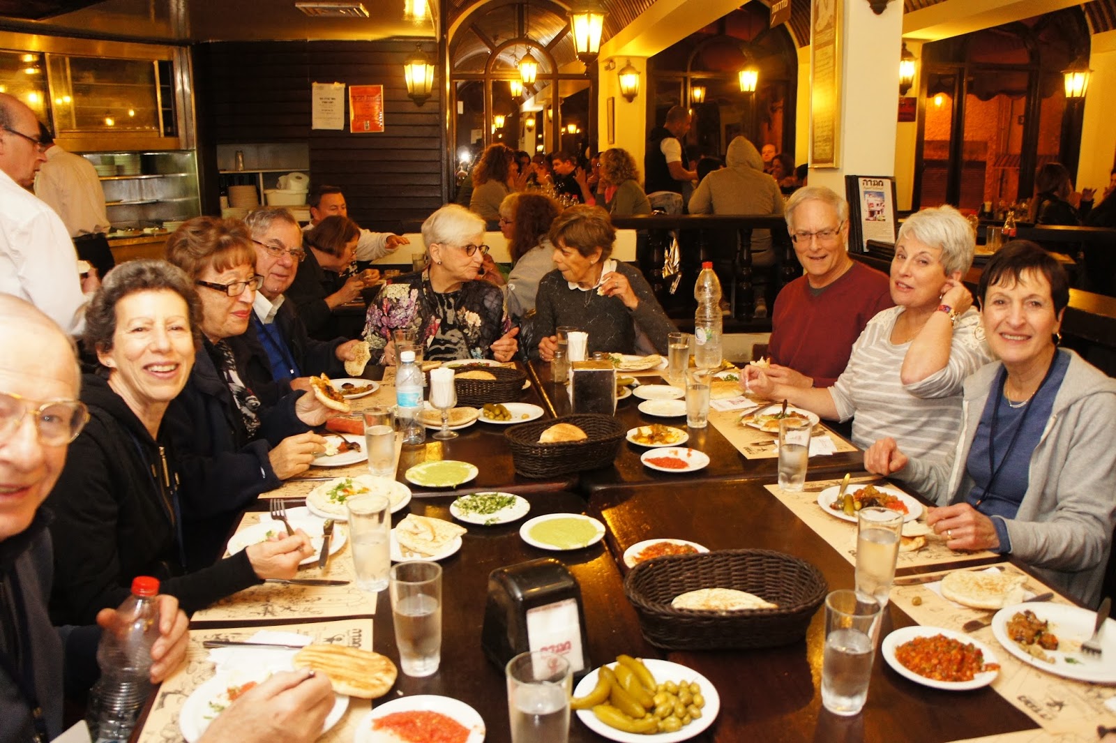 At night, we ate in a Yemenite restaurant in Tel Aviv……where getting served lots of salads and pita….family style was fun….followed by skewered lamb, chicken, and kebobs….and then we had about an ten block walk back to our hotel…